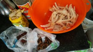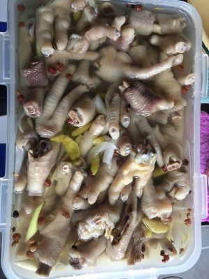 将煮好的水和鸡爪放在一起,水盖过鸡爪