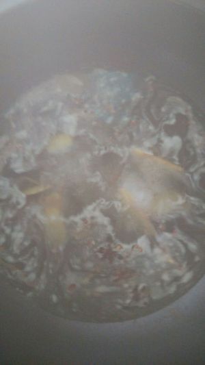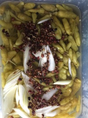 5、容器中倒入开水,放入花椒和泡椒先泡几分钟。倒入泡椒水,加姜片、大葱、白醋,适量盐和味精,混合均匀。