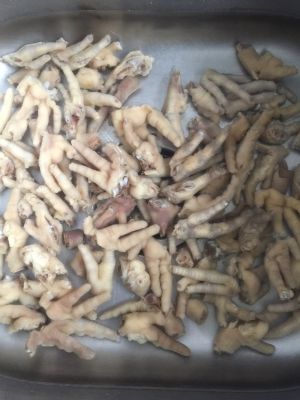 先将鸡爪洗干净(要完全解冻才可以,要不然鸡爪煮过之后会变黑就不好看了)