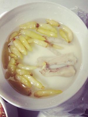 用冰水或冷开水把鸡爪洗两三遍去油。煮爪子的姜片花椒别丢哦,跟爪子一起过水