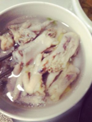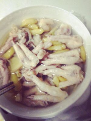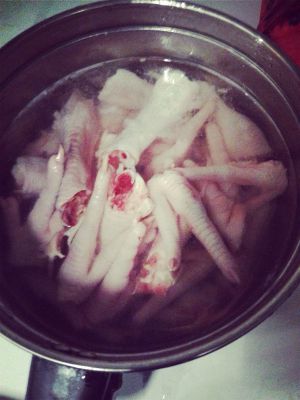 锅里放适量的水加入生姜、花椒煮开,倒入洗净的鸡爪,煮10至15分钟加入适量的盐烧开(按平常煮汤的加法)
