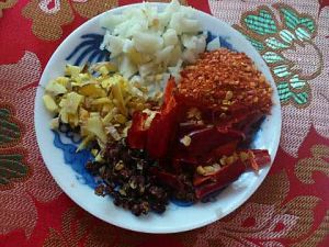做油微热,葱姜蒜,干辣椒,大料,麻椒炝锅