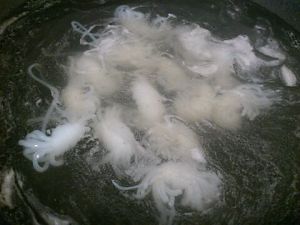 大火煮开后,依次下入食材,鳝鱼、鹌鹑蛋、鸭血、黄喉、午餐肉、火腿肠、毛肚、鸭肠,煮开约3分钟左右。然后移到大盘里准备泼油。