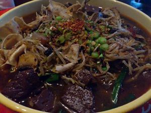 锅里热油,爆香姜蒜碎,辣椒段和花椒粒。然后炒香酱汁和火腿粒。下豆芽略炒,加水煮开后下血旺,毛肚魔芋粉丝和青蒜段。煮至入味。