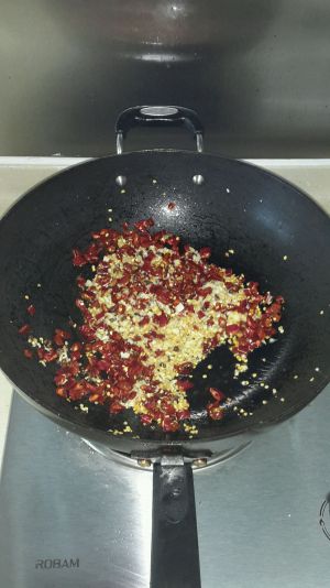 重新起锅放少许油,先放花椒再放蒜末炒出香味。再放入辣椒翻炒片刻,注意不要炒糊了。
