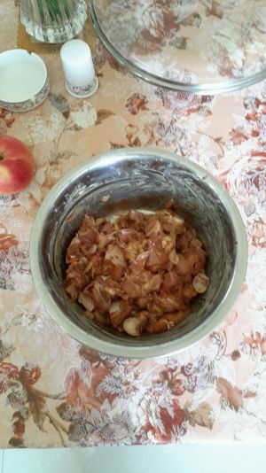 鸡腿肉焯一下,然后切成块,大小随意啦,不要太小