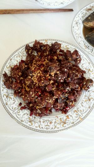 热锅凉油,放入葱段炒香,再倒入鸡块大火炒香就转成小火,倒入辣椒段和黄飞红的辣椒继续煸炒,炒出花椒及辣椒的香味即可关火成盘,然后就可以出锅了!炒出来的辣子鸡和在外面吃的口感一样,大概是姥姥家的辣椒比较给力,比外面吃的还要辣,太过瘾了~