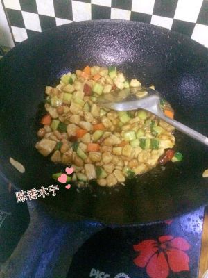 再下入炸好的鸡丁快速翻炒,鸡丁需要急火急炒,火小就容易变老