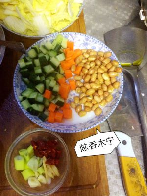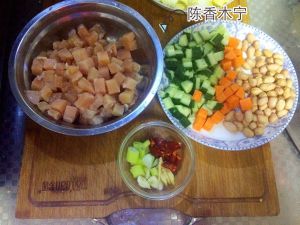 然后起锅烧油,放入蒜干辣椒炒香,放一勺豆瓣酱炒香,再放入胡萝卜丁,鸡胸肉,黄瓜丁炒香