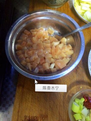肉切丁,加入淀粉料酒腌制半个小时以上