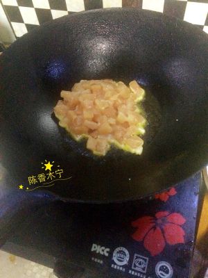 锅中加入适量植物油,先下入鸡丁滑一下。