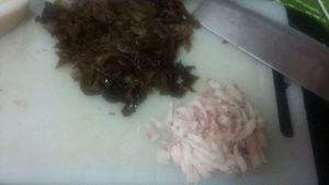 笋,木耳,茄子,青椒,肉丝全部切丝。我这里只有五花肉切丝了。笋,木耳用开水焯下