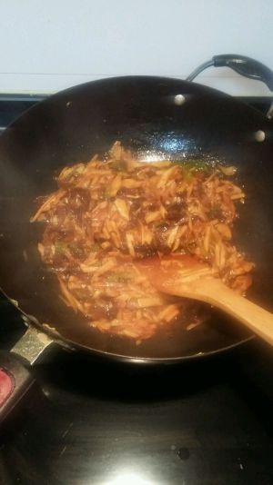 依次倒入,笋,木耳,茄子翻炒。加入调料汁,加适量水,闷烧也可以不盖盖子,炒至汁微收干即可。当时没有醋,我用番茄酱代替,结果烧完味道也不错!