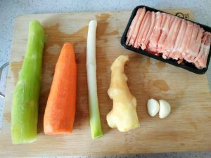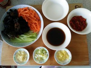胡萝卜,青椒切丝,木耳用热水泡开,切丝备用,葱姜蒜切丝