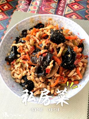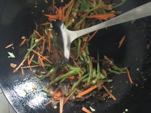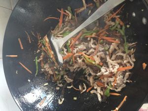 热锅中再放油,加葱姜蒜丝炒3秒马上加入胡萝卜丝青椒丝木耳丝翻炒1分钟,加入肉丝继续翻炒2分钟