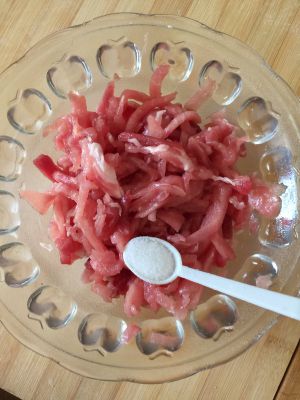 猪肉切丝,加入盐抓到发黏,加入料酒和淀粉,继续抓捏,腌20分钟