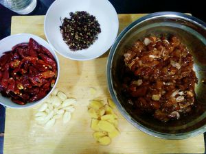 用炸完的花椒,盐糖酱油料酒葱姜把鸡块淹一个小时,时间允许的话可以多淹会