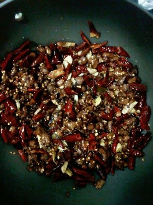 放炸过的鸡肉丁进去翻炒,注意好火候,辣椒别炒糊了;
