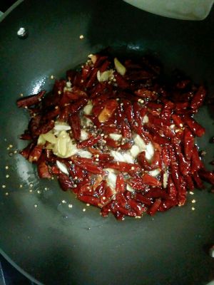 剪好的干辣椒段也倒进去翻炒,炒出辣椒的香味;