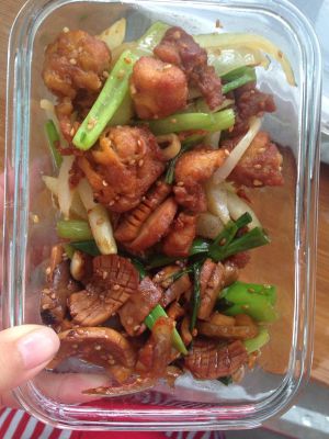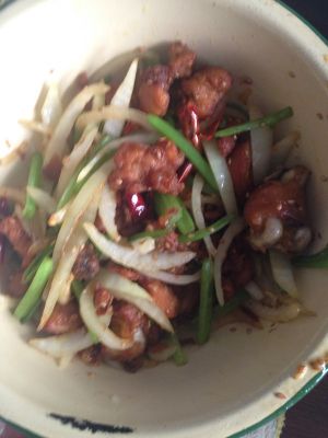 最后有点着急了!没有拍好!最后油锅里放少许油放入芝麻和辣椒段!翻炒几下以后放入鸡肉芹菜和圆葱 放入一勺糖翻炒几次以后就可以出锅啦
