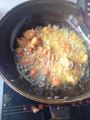 锅中倒油,大火烧至油温六成热时改中火,将鸡肉块放入油中浸炸大约5分钟,使鸡肉块炸到外皮干焦,变成棕红色。