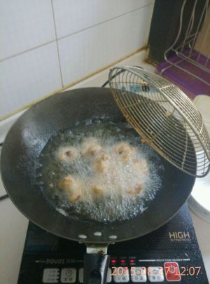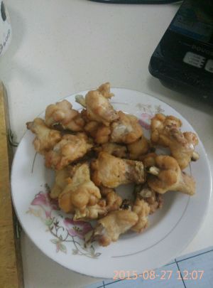 鸡翅根腌半小时后,锅里多放些油,大火将鸡肉炸至金黄色(一定要大火,小火的话会把鸡肉炸老),大火外表炸至金黄色后捞出备用。