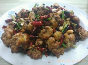 锅里放入两倍平常炒菜的油(用刚炸过鸡肉的油就行,可以稍微多点),先将蒜、姜、大的葱段爆香,然后放入辣椒,青花椒炒香,炒出香味后将炸好的鸡肉放入,加一勺酱油,一小勺糖,翻炒两下即可。出锅前放入炸好的花生,香葱及适量熟芝麻,翻炒均后出锅即可