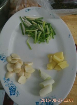 青椒切小块,如不怕啦手撕最好。葱切段,姜切片。八角洗好备用。