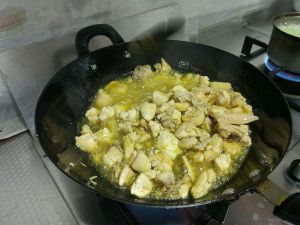 加入香油,放入鸡肉炒至五分熟后捞起备用