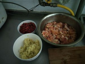 鸡肉用冷水洗净后用料酒盐巴腌制15分钟备用,干辣椒,姜蒜剁碎备用