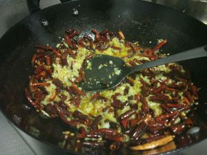 锅烧热,加油烧热,放入花椒和八角,辣椒,盐,煸炒,炒出香味,加入鸡块,要使劲炒,不停地炒,各种炒,炒的越干越好。
