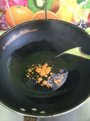 开火,放少许油没过锅底,放入白糖2勺,烤糖浆至起泡放入排骨翻炒