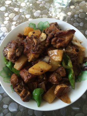 颜色均匀后加一小勺盐,加入煮排骨得汤约淹没排骨量,转小火盖上锅盖焖至土豆绵软