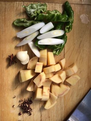 炒至土豆边缘开始变透明,加入水,刚没过土豆即可。