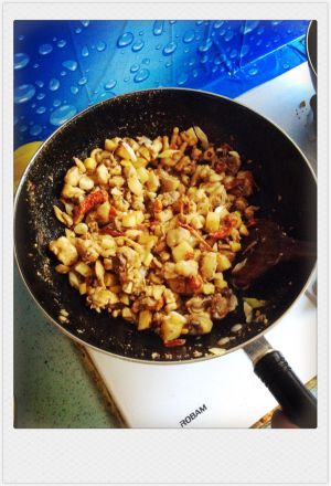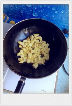 土豆哥出场了,土豆切成小方丁,放油翻炒一下,炒成金黄色盛盘备用,正宗的新疆辣子鸡是不放土豆的,大盘鸡才放土豆,不管啦自己喜欢放一些没关系的,呵呵