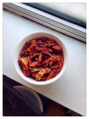 干辣椒洗净,用温水泡一会,每个用剪刀✂️剪成三段。