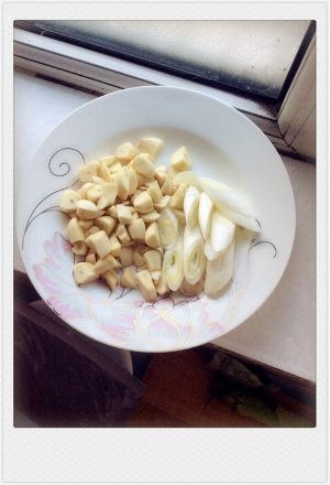 蒜剥好,可切也可不切,如要切不要切的太小,葱切片,姜切成小方丁,备用。
