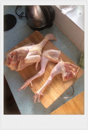 鸡腿肉切小块,盐,姜,料酒,五香粉,十三香,海鲜酱油,生抽,腌一宿,入味。