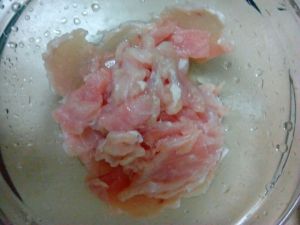 瘦肉切成薄片,加少许料酒(去腥)加少许盐,鸡精,抓匀。再加入两小勺生粉,再抓匀,待用。