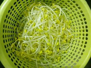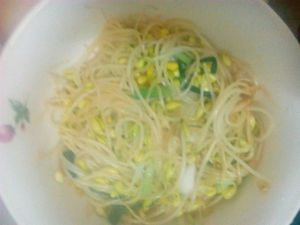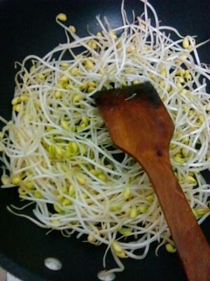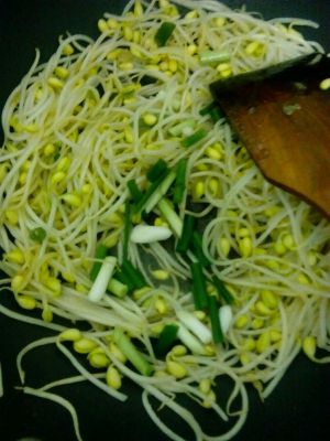 翻炒到豆芽断生,加入少许盐,跟葱。