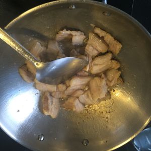 热锅后到三层肉,炒到出油,