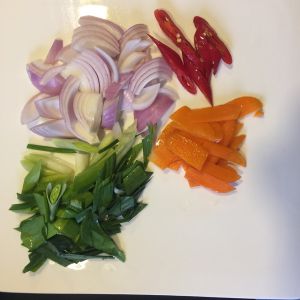 把洋葱、鲜蒜、红辣椒、红萝卜切好备用。