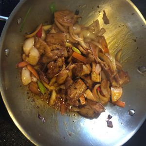 倒入老干妈豆豉酱一起炒,再把备好的调料,洋葱、青蒜、辣椒一起炒。