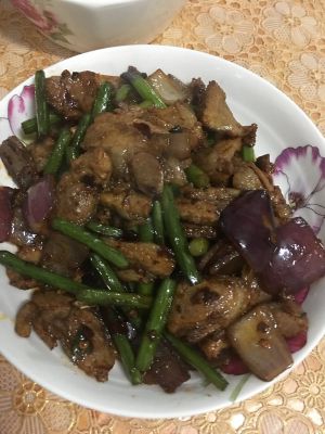 锅中放油,依次放入葱姜蒜蒜苔洋葱,豆瓣酱,酱油最后放入肉翻炒均匀即可出锅!
