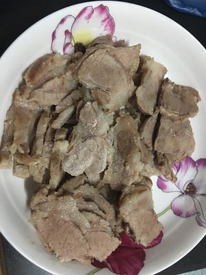 猪肉用清水煮一下取出,换干净的水再把肉煮十五分钟左右,用筷子扎一下,很顺利的扎透就可以了,煮好的肉晾凉后切薄片,如上图!