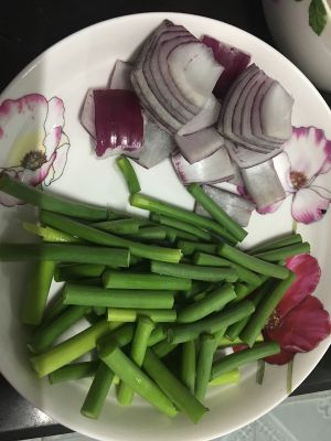 葱姜蒜切片,蒜苔切段,洋葱切块备用!