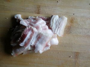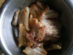 冷水下整块五花肉和生姜,煮至筷子可以插入肉中,撇净浮沫。肉捞出晾凉后 切薄片。