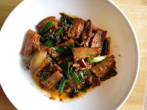 锅里下豆豉油(只要油一点点就够)开始冒烟放五花肉片 中火煸炒,五花肉的油会慢慢渗出物 继续煸炒 3分钟左右 下郫县豆瓣酱和 豆豉 翻炒均匀