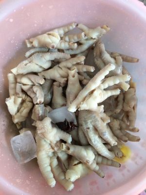 将食材准备好,洗净。 凉白开要先放凉,准备些冰水,或者冰块都可以。 凤爪减去指甲,可以稍微切小。