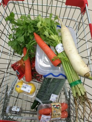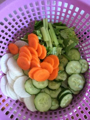 准备好的蔬菜,喜欢吃蔬菜的可以多加哦,喜剧个人口味。注意片不要切得太薄,容易酸的快!